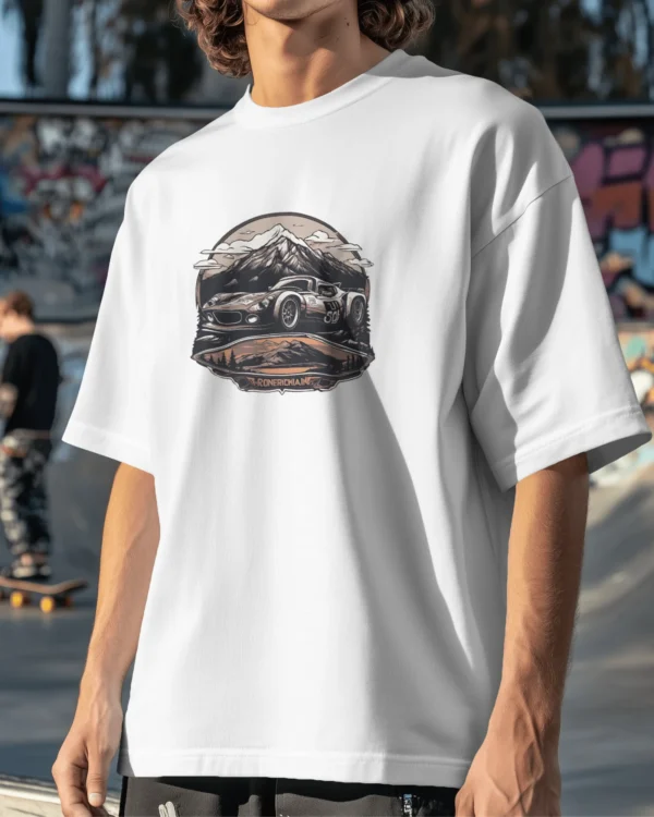 Embrace the thrill of a mountain race with this graphic t-shirt. It showcases a stylized illustration of a race car speeding through a rugged mountain landscape, accompanied by the text “RONDINE RIANE.” Perfect for motorsport enthusiasts and those who appreciate unique designs. Made from comfortable white fabric for everyday wear.